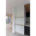 撤去不可な耐力壁を活かした収納スペース。収納裏には冷蔵庫置き場を設け、生活感の出過ぎないLDKを目指します。