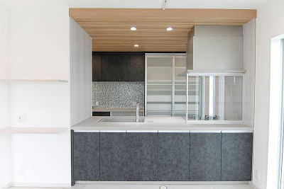 空間をルーズに仕切り、キッチンの目隠しの役割も果たしていた耐力壁。