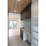 物が溢れがちなキッチン周りには、開き扉の収納もプラス。