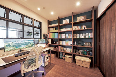 LDKと隣接する洋室をL字の大きな室内窓を設置してこもれる自宅オフィスに変身。落ち着いたウォールナットのオフィスで仕事もはかどります。透明ガラスの窓からは仕事中もリビングの家族の様子を感じられます。また、キッチン裏の柱を活用し、読書家の奥様の憧れ「飾れる本棚」を形に。ご夫婦が個々に有意義な時間を過ごせる場所をつくりました。