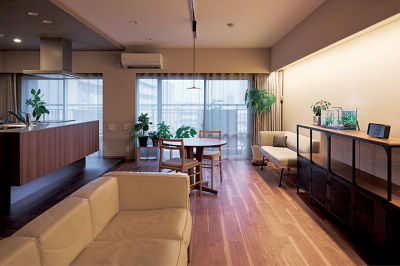 壁側の梁は垂れ壁を造作して隠し、間接照明をプラス。美しい光のラインが浮かび上がり、空間をあたたかく照らしながら、スタイリッシュな印象を与えます。カーテンボックスは垂れ壁のラインと合わせて造作。壁をくり抜いて作ったかのような一体感のあるデザインに。綿密な色彩計画と直線を活かした空間設計でインテリアを整理し、広がり感と落ち着き感を両立。ご夫婦ふたりが豊かに暮らせるシンプルで美しい住まいが生まれました。