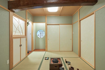 数寄屋造りの何種類もある丸窓の花模様の中から、ひと目で気に入りました。後で、丸い造形は壁の施工もクロス貼りも技術的に難しいと聞きましたが、職人さんがキレイに仕上げてくださいました。遊び心がある茶室に仕上がって嬉しいです。