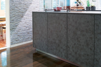 以前のカップボードの吊り戸棚はモノの出し入れが不便でしたが、今回はロータイプにしてひと目で取り出せるようになりました。戸棚を取り払ってあらわれた壁面には凹凸感のある素材をあしらい、LDK全体を好みのコーディネイトに仕上げました。