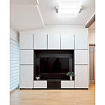 “スピーカー付き照明”と大画面テレビでホームシアターを楽しみたいと決めておられたご主人。リビングがすっきり片付くように大容量収納「キュビオス」をご提案しました。美しいホワイトの扉で統一感のあるインテリアに。「カフェみたいに音が降ってくる」と、感動され、映画鑑賞や誕生日会、クリスマス会を楽しんでおられます。