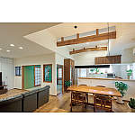 お子様の独立を機に、ご夫婦で心地よく過ごせる空間にとLDKを一新されたK様。ご希望だった明るさ・開放感を実現するために、キッチンをL型から吊り戸棚のないI型対面式に変更し、ダイニングを広めに確保。さらにリビングとダイニングの間にあった引き戸と垂れ壁をなくし、LDKをひとつながりの空間に仕上げています。横方向の広がりだけでなく縦方向への開放感も叶えているのが、解体工事で現れた旧居の美しい梁。その佇まいの美しさに感銘を受け、急遽プランを変更。現しにした梁を際立たせるため、天井を折り上げることでデザイン性の高い空間を生み出しました。「どこにいても気配と声が届くから、お互い好きなことをしながら会話も楽しめます」とK様ご夫婦は心豊かな日々をお過ごしです。