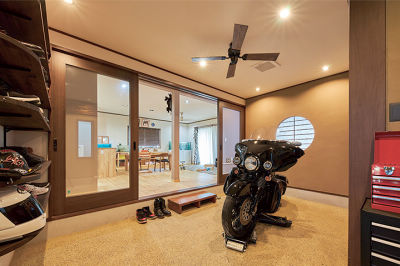 実家を受け継いだM様は大好きなバイクのため、未活用の和室部分のリフォームを決意。大胆に和室2部屋を使い、玄関を兼ねたインナーガレージを創造。バイクを手入れしながらも、家族の存在を感じられるようLDKとは透明ガラスの大型引き戸で仕切りました。リビングからもいつでもバイクを愛でることができます。