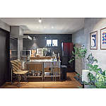 キッチンは自らカフェの厨房に立つH様が使い慣れた厨房機器を選択。メタルな質感が映えるアイランドスタイルに。開放感を高めるためLDKに隣接する寝室の壁は、縦格子の建具でゆるやかに仕切りました。照明はすべて集光タイプで、陰影のある空間を演出。コンクリート調の壁は、年を重ねても違和感のない色調のものを選び、落ち着いた印象に仕上げました。
