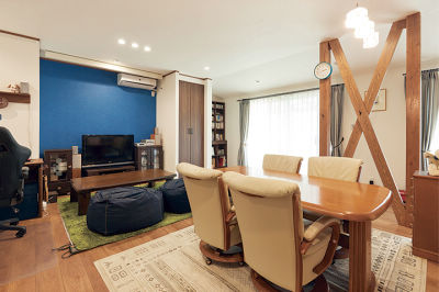 耐震性向上のため補強した筋交いは、内装に合わせて塗装。ブルーのアクセント壁上部にはスクリーンを設置しています。