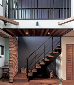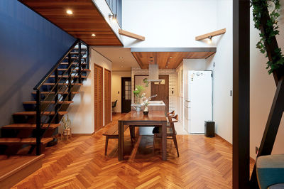 オールドアメリカンを意識した床や木の天井をはじめ、アイアンの階段やネイビーの壁、レンガの装飾など、リビングにはご主人のこだわりが満載!趣味のアイテムに囲まれて、家族団らんを楽しめる住まいになりました。