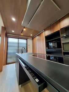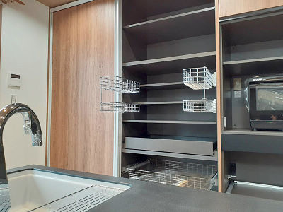 天井から床までの大容量カップボードでスッキリ収納。扉を閉めれば重厚な家具調が空間にマッチ。並ぶと狭くなりがちなシンクも三方向から使えます。