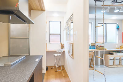 キッチン横の奥様専用のミニ書斎。キッズルームとの間に室内窓をしつらえ、お子様の様子を見守れるようにしました。