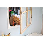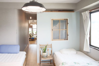 隣接するウォークインクローゼットとの間にヴィンテージの室内窓を設置。ブルーの壁紙ともマッチ。