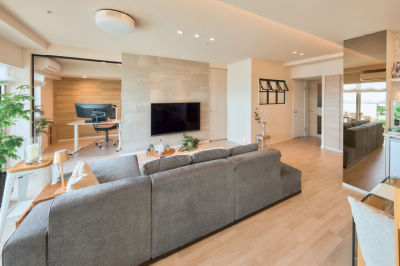 終の棲家として、新築マンションをおふたり好みの空間へとリフォームされたT様。間仕切り壁をなくし大空間としたLDKは、まるでリゾートホテルのようなくつろぎ感あふれる空間に。一角には奥様が好きな植物のためにガラスの温室のようなコンサバトリースペースを新設。日中は植物たちと自然光で爽やかに、夜は照明と夜景でゆったりと至福の時間を味わえる空間になりました。