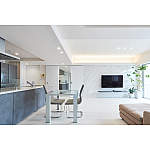お子様ふたりの個室を設けるのを機に、眺望のよさを活かして全面リフォーム。日当たりがよく、海の見える側にLDKを配置。キッチンは対面式のオープンタイプにして明るさと開放感をプラス。個室へはリビングを必ず通ってから入室するように間取りを決め、家族のコミュニケーションに配慮。随所に収納を設けて、スッキリ片付くスタイリッシュな空間に仕上げました。