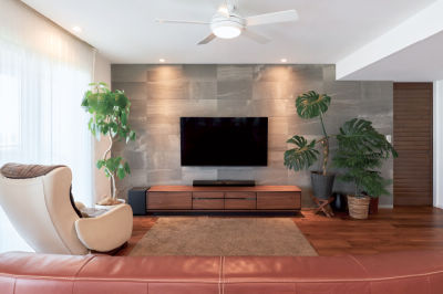 ハワイ旅行がお好きなH様はご自宅をリゾート感のある空間へ全面リフォーム。LDKはより広がりを感じられるよう壁や天井の凹凸を整えてスマートに。素材感が異なる建材をアレンジしハイセンスな空間に仕上げました。動線やレイアウトも見直してスタイリッシュさと使いやすさを両立しました。