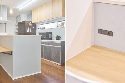 築3年のお住まいを自分たち好みの内装で、より心地よい空間へ変えたいと、LDKの壁や天井を大幅にチェンジしました。特に、質感や風合いにこだわりご夫婦が自らペイントされたグレーの壁は、時間や天気で表情が変わり、印象的な空間を演出します。またカウンターテーブルを低くしたことで仕事用のデスクにも活用でき、LDKでの過ごし方にも変化が生まれました。