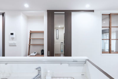 手元が隠れる対面キッチンと収納力が抜群のカップボードによって、キッチン廻りもスッキリ。