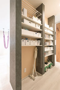 テレビを設置した壁の裏側に、書類や小物を収納できる棚を造作したことで、リビングをすっきり保てます。
