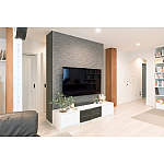 テレビを設置した壁の裏側に、書類や小物を収納できる棚を造作したことで、リビングをすっきり保てます。