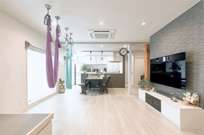 LDKの中央に、奥様ご希望の空中ヨガ用のハンモックを設置。お子様がブランコ代わりにして遊んだり、楽しみいっぱいの空間に。