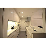 キッチンとカップボードはホワイトで統一。間接照明が一気に雰囲気を強調してくれます。