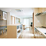 ゆったりしたキッチンスペースは、みんなで調理しても窮屈にならない広々サイズ。年中快適に過ごせる床暖房や空調設備も万全。