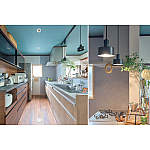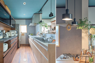 ふたりでも動きやすいスペースを確保。木目、ブルー、グレーの配色とペンダントライトがカフェのような印象に。