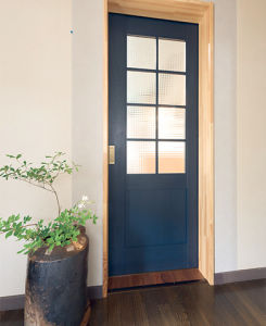 玄関ホール側から見たキッチンのドア。チェッカー柄のガラスから光が入り、明るさと開放感を生み出します。