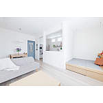 ホワイトのクロスをベースにして、明るく清楚なLDKを演出。ブルーの内装ドアや畳コーナーをアクセントにし、空間を引き締めます。残す必要がある壁や柱を利用した、セミクローズドキッチン。開口部を大きくし、リビングとのつながりを意識。