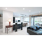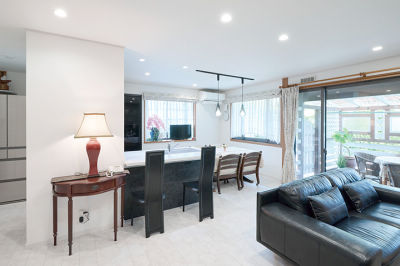 白を基調にしたLDKはご夫婦が大切にされてきた調度品との相性も抜群。かわいい愛犬とのんびり過ごせる、暮らしの中心です。