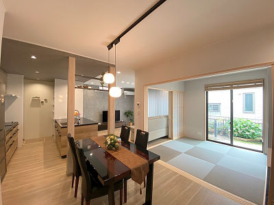 間仕切り壁を撤去し窓も大きくしたことで明るいLDKと和室へ。LDKと和室を繋ぐことで孤立感なく開放的な大空間を実現。