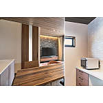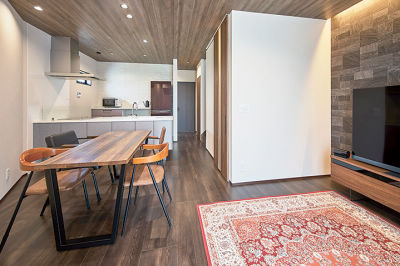 明るいオープンキッチンの横に天井高いっぱいのドアを設置。間接照明の効果も相まって、広がりを感じられるLDKになりました。