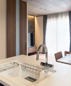 道路拡張で変形になった敷地を、最大限に活かした間取りの建替えをご提案。設備や内装はグレードの高低を織り交ぜてメリハリをつけ、ファッションやインテリアがお好きなご夫婦にぴったりの個性的な住まいが完成しました。