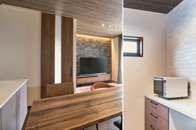 明るいオープンキッチンの横に天井高いっぱいのドアを設置。間接照明の効果も相まって、広がりを感じられるLDKになりました。