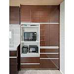 キッチン横に設けた天井いっぱいのカップボード。調理家電もすっきり収納でき、使い勝手も上々です。