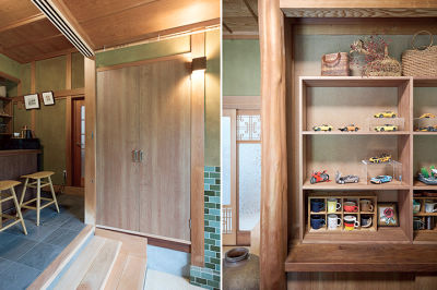 玄関収納を新設して、いつも片付いた状態に。趣味の小物をディスプレイする飾り棚も設けました。