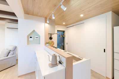 キッチンの天井は木目にしてデザイン性をアップ。インターホンなどのリモコンは家の形にデザインしたニッチに配置しています。