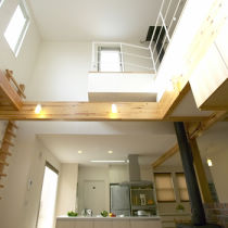 玄関の位置を変更した上で、3室をつないでLDK用に広い空間を確保。吹き抜けを予定した場所が平屋であったため、2階天井まで柱を伸ばし、高い吹き抜けを創りました。玄関を入るとすぐに現れるLDKの大空間は圧倒的な迫力で、来客が一様に驚かれるとか。白を基調に無垢材の梁と柱をアクセントにした室内は、C様ご夫妻念願の光と風があふれる明るい空間となりました。キッチンに立てば、玄関から2階まで家全体の気配を感じ取ることができるそうです。