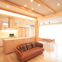 や、設備の老朽化がきっかけで建替を決意されました。建替前はリビングとダイニングが別々に分かれているなど1部屋1部屋が狭く、また収納も不足していたためベビー用品やお子様のおもちゃを片付けるのが大変だったというM様。そこで、玄関横の大型収納や洗面室、ダイニング等に適材適所の収納スペースを確保。キッチン背面の収納には、なんと冷蔵庫もすっぽり収まります。「キッチン全体が見えるので、生活感を出したくなかったんです」とM様が言うように、扉を閉めれば中が見えず、お部屋の印象もすっきり。間取りに合わせた効率的な収納スペースが、インテリアやお部屋のテイストに自然と溶け込んでいます。 現在は育休中ですが共働きで忙しい奥様のため、LDKを中心に生活動線も見直しました。回遊できるキッチンは、調理中の出し入れや行き来もスムーズ。水廻りにもアクセスしやすく、お部屋とお部屋を行ったり来たりする必要がありません。カウンターからは室内が一望できるため「家族がどこにいても家族のつながりを感じられるんです」と、奥様もニッコリ。どこへ行くにも家族が必ずリビングを通る間取りは、家事をしながらでも自然なコミュニケーションを生んでくれます。その他にも、キッチンに隣接の和室は、お子様のお昼寝スペースや洗濯物を畳んだりなど、多目的に使える憩いの空間。お部屋全体を包み込むメープル材のナチュラルな雰囲気は、インテリアがお好きなご夫妻が自らセレクトしたものだそう。家族にうれしい住み心地の中にも、さりげないこだわりが詰まっています。