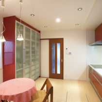 そして奥様が選ばれたのが、ヴィヴィッドなレッドのシステムキッチン。最新のIHクッキングヒーターと食器洗い乾燥機を装備し、家電収納や大きなカップボードで収納量も充分。また、応接間を解体して、空間を贅沢に使ったトイレ・洗面・バスルームを配置。おそうじラクラクの先進設備で、「家事がラクに楽しくなった」と奥様も大喜びです。