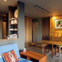 お子様が独立されたのを機に、ひとり暮らしがしやすい住まいをテーマにリフォーム。廊下をなくしたことで生活動線がスムーズになりました。全体を落ち着いたトーンでまとめた中、お気に入りのリトグラフを飾る壁は板張りに。素敵なアクセントになっています。