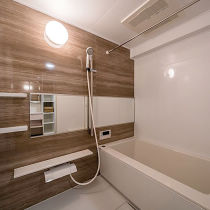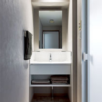お手入れ簡単浴室と保温浴槽。室調湿効果を考えた少しレトロな雰囲気を持つ洗面所[千葉県]