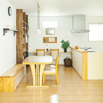 築31年の中古戸建を購入したM様は、建物本来の質の良さに注目し、新旧を融合させた再生リフォームに挑戦。「自然な温かみ」をテーマに、外装や内装の素材を厳選しました。天井と壁の一部にシナベニヤを、床には杉板を使い、優しい温もりのある部屋に変身したリビング。自然と家族の笑顔が集まります。撤去できない壁を小窓のある収納スペースにしたアイデアも秀逸です。水廻りはすべて最新設備に取り換え、キッチンはアイランド型の採用により、明るく開放的なスペースに生まれ変わりました。施工店: 株式会社ヤマガタヤ REFORM Garden