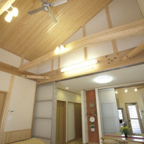 また、足元の段差をなくしたいが、天井は低くしたくないとのことでしたので、天井裏にあった立派な梁をあらわにし、天井を高く開放感と木のぬくもりを感じられるようにしました。