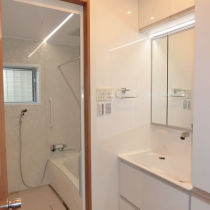 使い勝手が悪く、狭い浴室と洗面所の収納不足が悩みだったH様ご夫婦。玄関横の収納スペースを浴室に取り込むアイデアで、広々とした一坪タイプのシステムバスを実現しました。キッチンに洗面所への出入口を設けて、移動距離が最短でラクに。また、使いやすくなっただけではなく、リビングの空調が洗面所にまで届くようにもなり、日々の暮らしの快適さを一層高めています。洗濯機置き場の移動により広がったスペースには、収納力もたっぷりの幅の広い洗面台を設置。「まるでホテルみたい」と奥様も大満足です。施工店: リファイン五日市 株式会社丸共(旧:リファイン五日市)