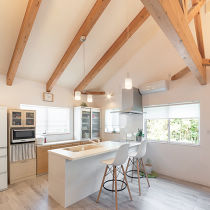 お子様の独立を機に、ご夫婦で心地よく過ごせる空間にとLDKを一新されたK様。ご希望だった明るさ・開放感を実現するために、キッチンをL型から吊り戸棚のないI型対面式に変更し、ダイニングを広めに確保。さらにリビングとダイニングの間にあった引き戸と垂れ壁をなくし、LDKをひとつながりの空間に仕上げています。横方向の広がりだけでなく縦方向への開放感も叶えているのが、解体工事で現れた旧居の美しい梁。その佇まいの美しさに感銘を受け、急遽プランを変更。現しにした梁を際立たせるため、天井を折り上げることでデザイン性の高い空間を生み出しました。「どこにいても気配と声が届くから、お互い好きなことをしながら会話も楽しめます」とK様ご夫婦は心豊かな日々をお過ごしです。施工店: 株式会社リライフ日興