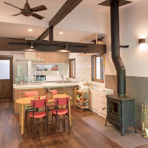 建物の趣をできるだけ残したいというご要望に、大勢の親族が会した馴染み深い二間続きの和室の配置はそのままに、欄間障子は空間のアイコンとして再生。お母様が歩行器でも移動しやすいように、LDKはバリアフリーに配慮した洋室に。梁をあらわにした勾配天井は上方向への新たな表情を生み、柱と梁は塗装して落ち着いた古民家調を実現。