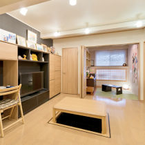 いちばんの特長となるのは、商店街に面して設計された趣味のお部屋。琉球畳をあしらった和モダンな空間には、折り紙が趣味だという奥様が、ご自身の作品を飾れる飾り棚を設けました。お部屋の外にも、作品をディスプレイできるショーウインドウを設置。色とりどりの折り紙に彩られた華やかな表情の住まいが生まれました。また、壁面収納や掘りごたつを採用したリビング、収納力抜群のシステムキッチンなど、暮らしの中心となる空間の使い心地も一新。趣味を活かす空間と、住まいの機能性が両立した住まいにK様も「毎日が楽しい」とご満悦のご様子です。施工店: 株式会社U建築(旧:リファイン飯田)