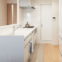 そこで、打ち合わせを重ね、お子様に目が届きやすい間取りと家事の負担軽減を中心にしたプランをご提案しました。キッチンは調理中もお子様の様子がうかがえる対面型とし、対面カウンターの向こうに勉強スペースを配置。LDKと洗面室を隣接させて家事動線を短くしたほか、浴槽やトイレもお手入れがラクなタイプを採用しました。共有の玄関のすぐそばには団らんの場となるホールをしつらえて、ご両親や妹様と過ごす時間も大切にしています。施工店: 株式会社クレス 豊岡店(旧:リファイン豊岡)