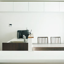リビングダイニングとの間に段差が生まれ、床と天井の色柄を変えたことで、まるでステージのようなキッチンに。視線が高くなりリビングダイニングの広がりを感じながら作業ができます。ふたり並んでもゆとりがあり、お料理するのが楽しく。キッチンの両側が通れるのでダイニングともすぐ行き来がしやすく、スムーズに配膳や後片付けもできます。